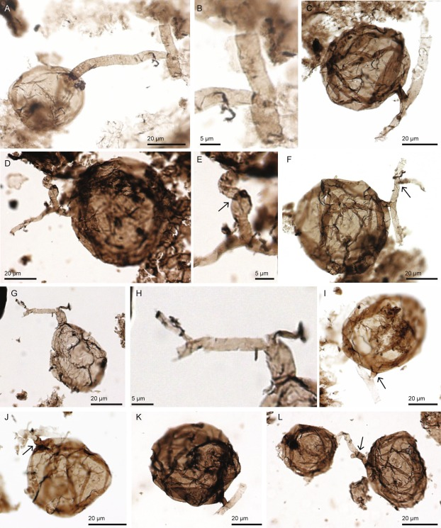 一类生活在泥盆纪、志留纪的巨型陆生疑似真菌生物:原杉藻Prototaxites;化石和假想复原图(Mary Parrish绘)。来源:Rotted wood–alga–fungus: the history and life of Prototaxites Dawson 1859