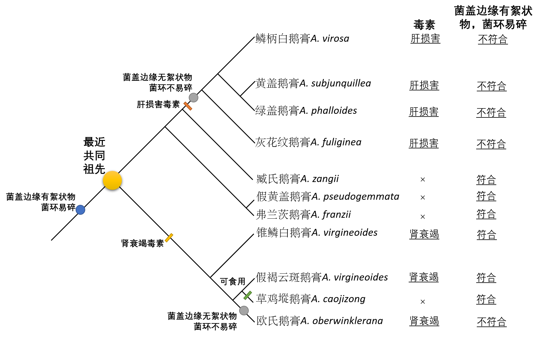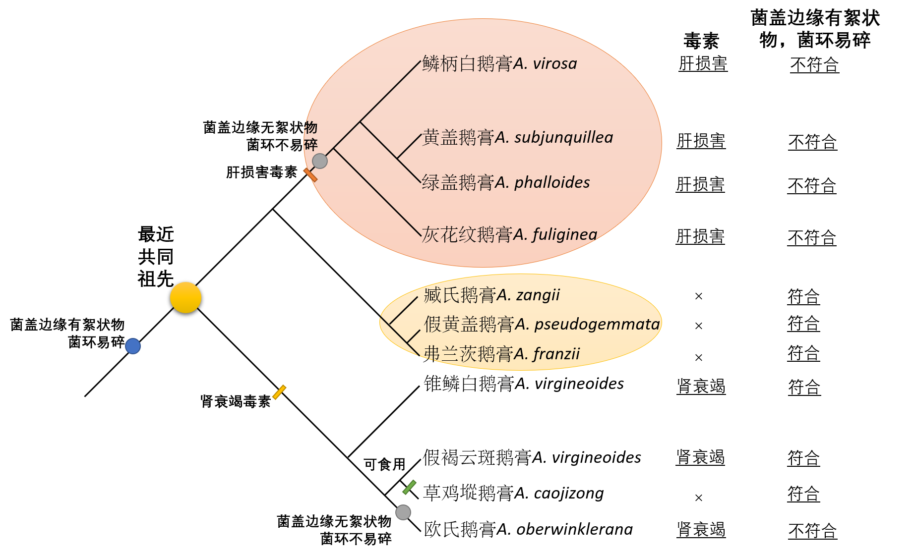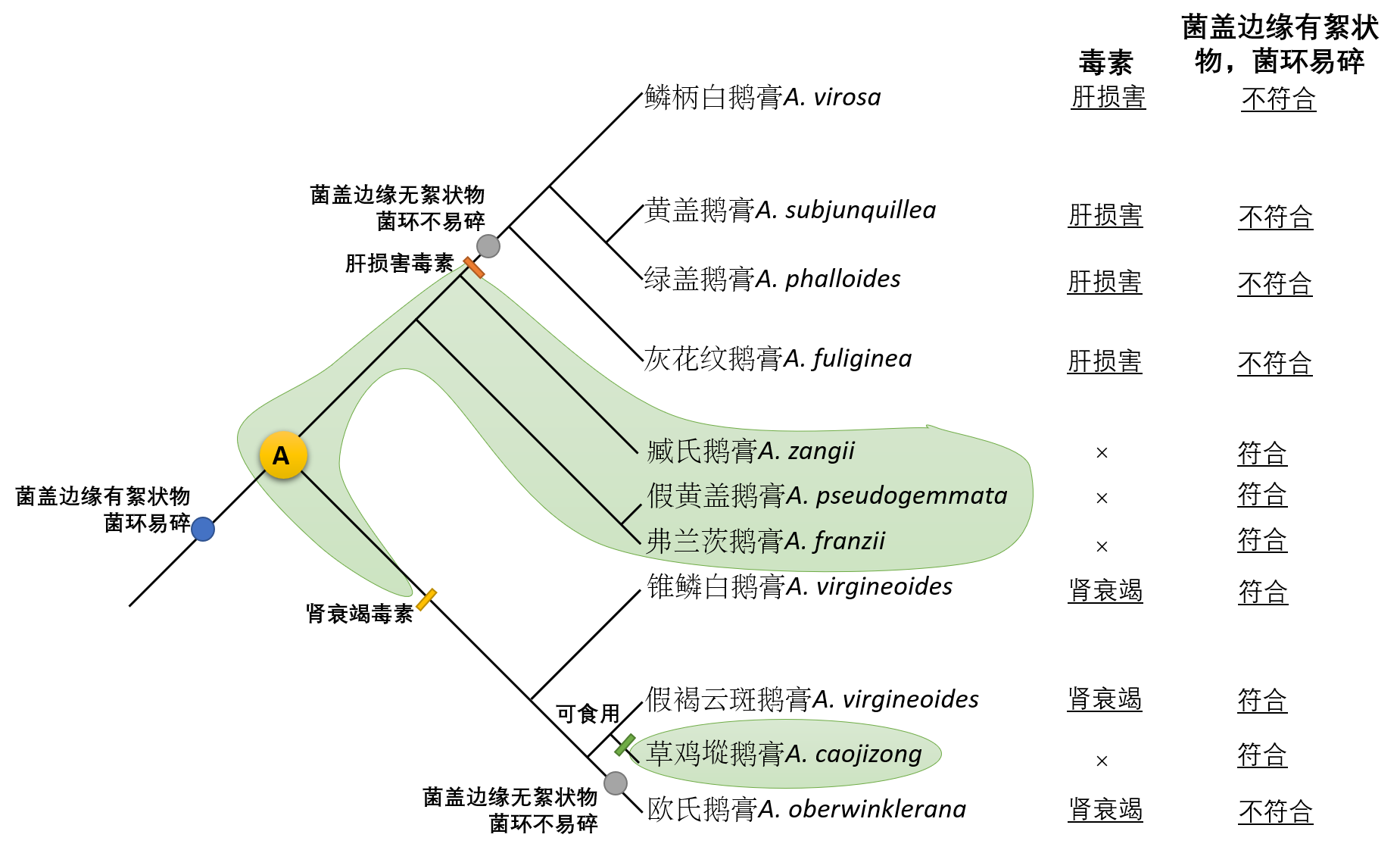 现在,我们将之前所分出的“毒鹅膏类”这个类群标记在系统树上: