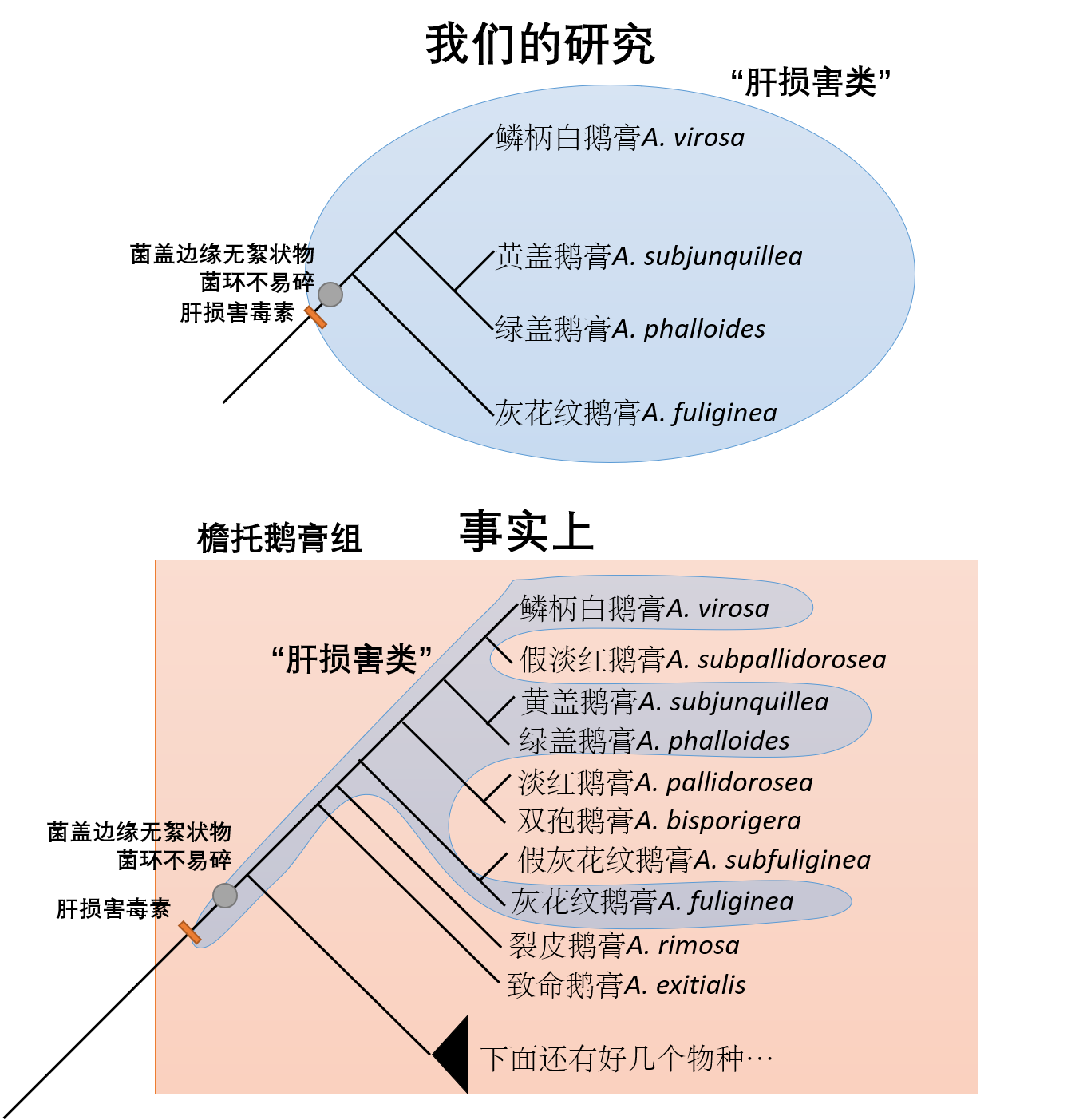 显然,“毒鹅膏类”和“无毒鹅膏类”都不是定义完备的类群,这些类群不能被系统学界所接受。那么什么样的类群,才是系统学所承认的呢?让我们来看看“肝损害类”。