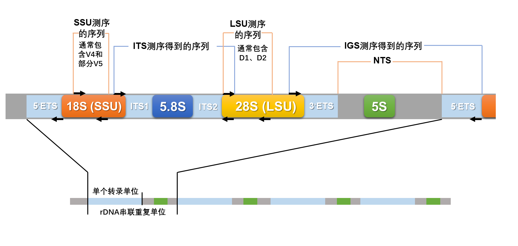 除了上述序列,转录单位(淡蓝色)的头和尾都有ETS序列。在一个转录单位和下一个转录单位之间的部分称作NTS序列,NTS包含5S rDNA基因。NTS、ETS统称为IGS序列。