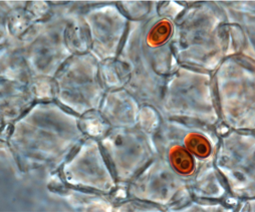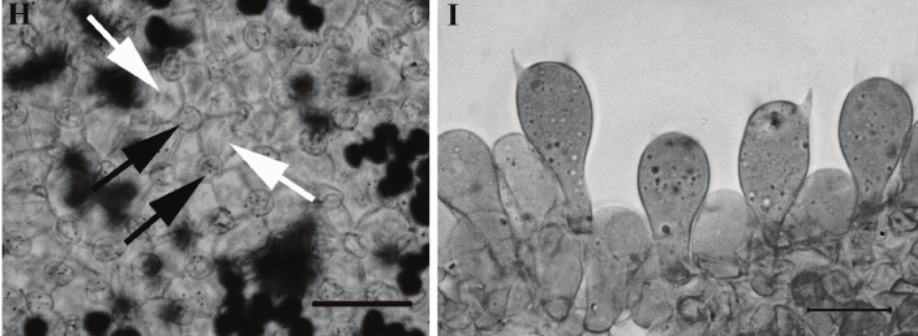 周细胞是排列在子实层上的一种细胞,它不是担子、原担子或囊状体。它常常排列在真正的担子周围,形状和原担子(发育中的担子)比较相似,不过更大更膨胀些,且不参与孢子的形成。周细胞相互重叠可以作为担子基部,起到调节担子间距,支撑担子,撑开子实层的作用。 ![]() Galerella nigeriensis的子实层俯视图。图中,红褐色卵圆形结构是从担子上脱落下来的孢子,透明的球形细胞是担子,而簇拥在担子周围、更大的格状细胞是周细胞。一般一个担子周围有4个周细胞包围。来源:A. Mešić et al. 2010 ![]() Parasola psathyrelloides的子实层俯视图(左)和侧视图(右)。左侧图中,黑色箭头所指球形细胞为担子,白色箭头所指的多边形细胞为周细胞,背景中虚焦的黑色颗粒是孢子。右侧图中,突出的拥有小梗的细胞为担子,而在担子周围下方,没有小梗的细胞为周细胞。来源:Ganga, Greeshma & Manimohan, Patinjareveettil. 2019 | ||