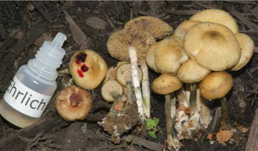 埃利希试剂是无色或淡黄色溶液,由0.5-2.0g二甲氨基苯甲醛C9H11NO(ρ-Dimethylaminobenzaldehyde,CAS:100-10-7)溶解在50mL浓盐酸和50mL 95%乙醇中的溶液。它可用于检测吲哚和尿胆素原。菌物学上,它可以指示麦角类化合物(如麦角酸二乙胺)和色胺(如裸盖菇素)的存在。在酸性条件下,这些物质中的吲哚和二甲氨基苯甲醛反应,生成双(3-吲哚)-(4-N,N-二甲基氨基苯基)甲烷(bis(3-indolyl)-(4-N,N-dimethylaminophenyl)methane)。 ![]() 埃利希试剂滴加在卵囊裸盖菇Psilocybe ovoideocystidiata上的阳性反应。来源:Britt A. Bunyard. Simple Chemistry for Better Mushroom ID |