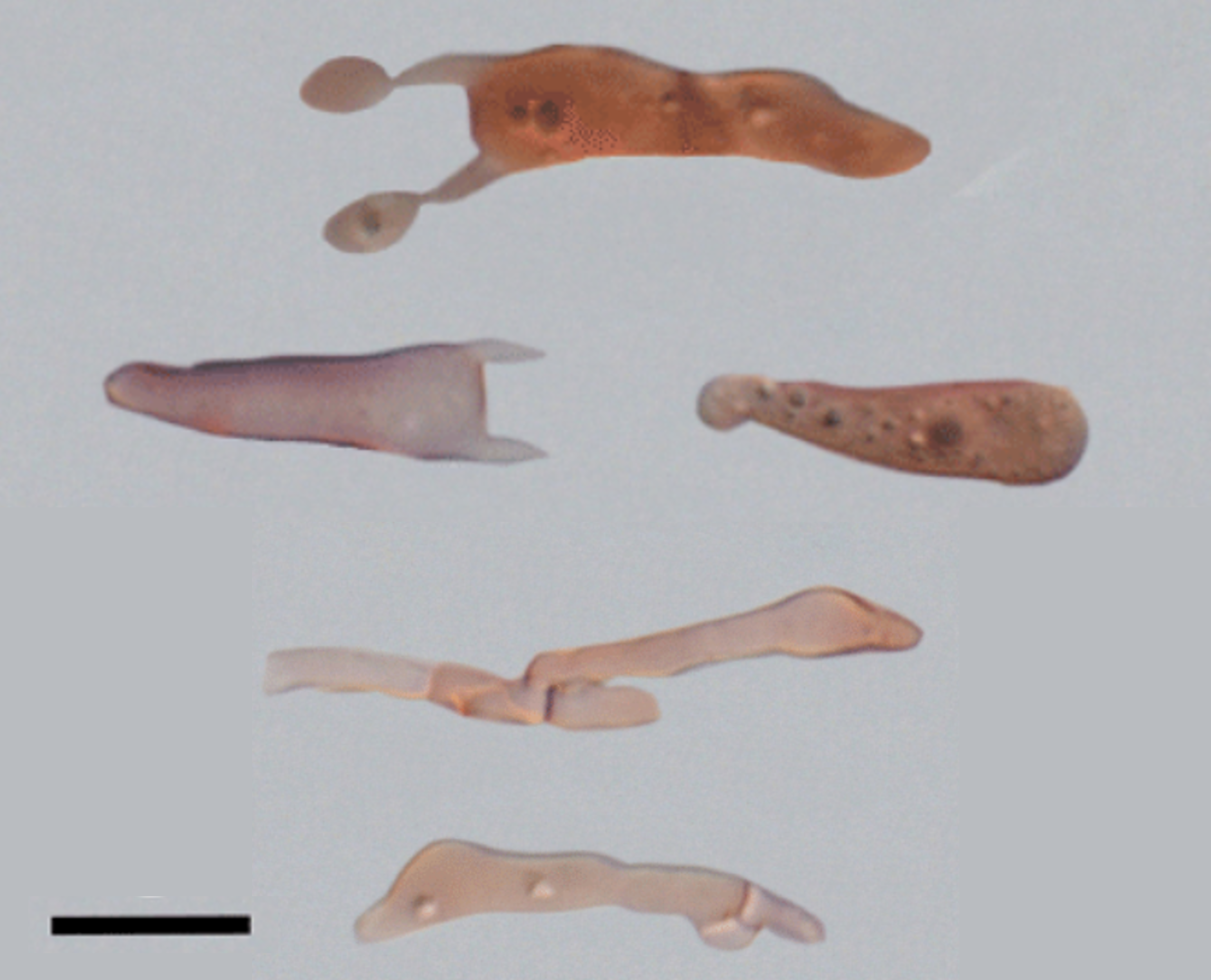 百山祖黑斑根孔菌Picipes baishanzuensis的担子(最上层和第二层左侧)、幼担子(第二层右侧)和小囊状体(第三、第四层)。比例尺=10μm。来源:10.1371/journal.pone.0159495