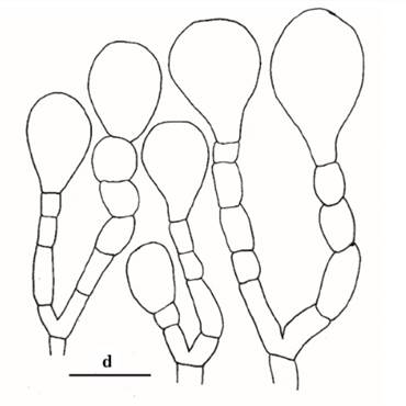 担孢子6-8.5×5-6µm,椭圆形,光滑,淡褐色,厚壁。担子多数2孢。侧生囊状体缺失,褶缘囊状体存在。