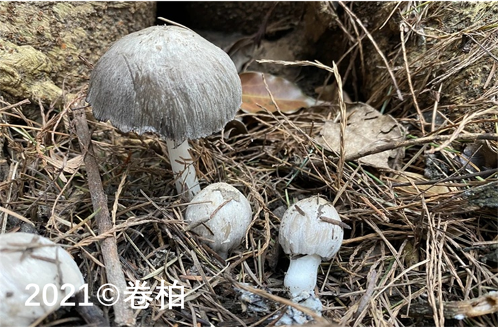 图二至三 幼年和成年的灰盖拟鬼伞C.cinerea,2类拟鬼伞。2类拟鬼伞的体型相对小,幼年菌盖表面被明显白色菌幕残余,成年后菌盖近似半透明状,可见条纹。灰盖拟鬼伞也是常用的模式物种之一。