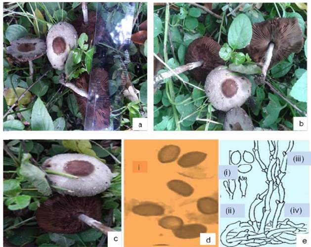 图3 层蘑菇属的Hymenagaricus mlimaniensis,a-c子实体,d-e显微结构:i担孢子,ii担子,iii-iv盖表菌丝 (引自Zubura Mwanga et.al.2014)