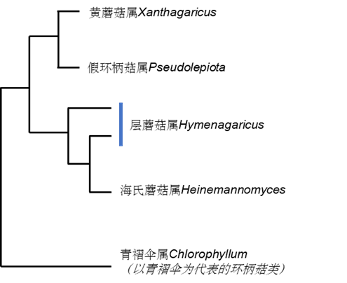 基于多篇参考文献,整理出黄蘑菇属、假环柄菇属、层蘑菇属和海氏蘑菇属的大致系统发育关系。青褶伞属为外群。