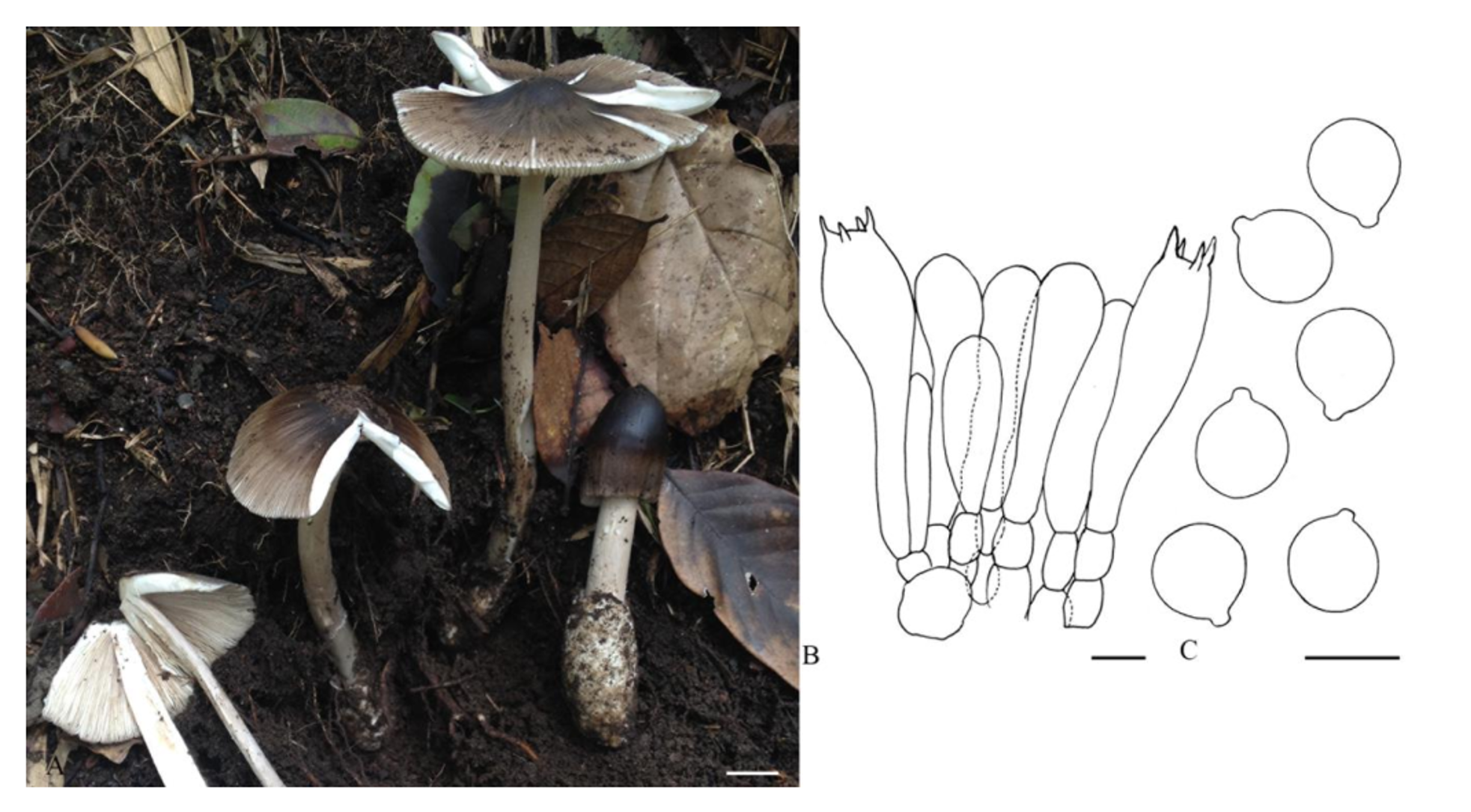 该种的主要特征是菌盖黄褐色至深褐色,边缘有沟纹;盖表菌幕残余颗粒状至锥状,污白色至褐色,容易脱落;菌褶白色,离生,小菌褶平截;菌柄被污白色至黄褐色纤维,中空,基部膨大,有环带状菌幕残余;菌环上位,近白色;担孢子宽椭圆形,非淀粉质;子实体各部位无锁状联合。......