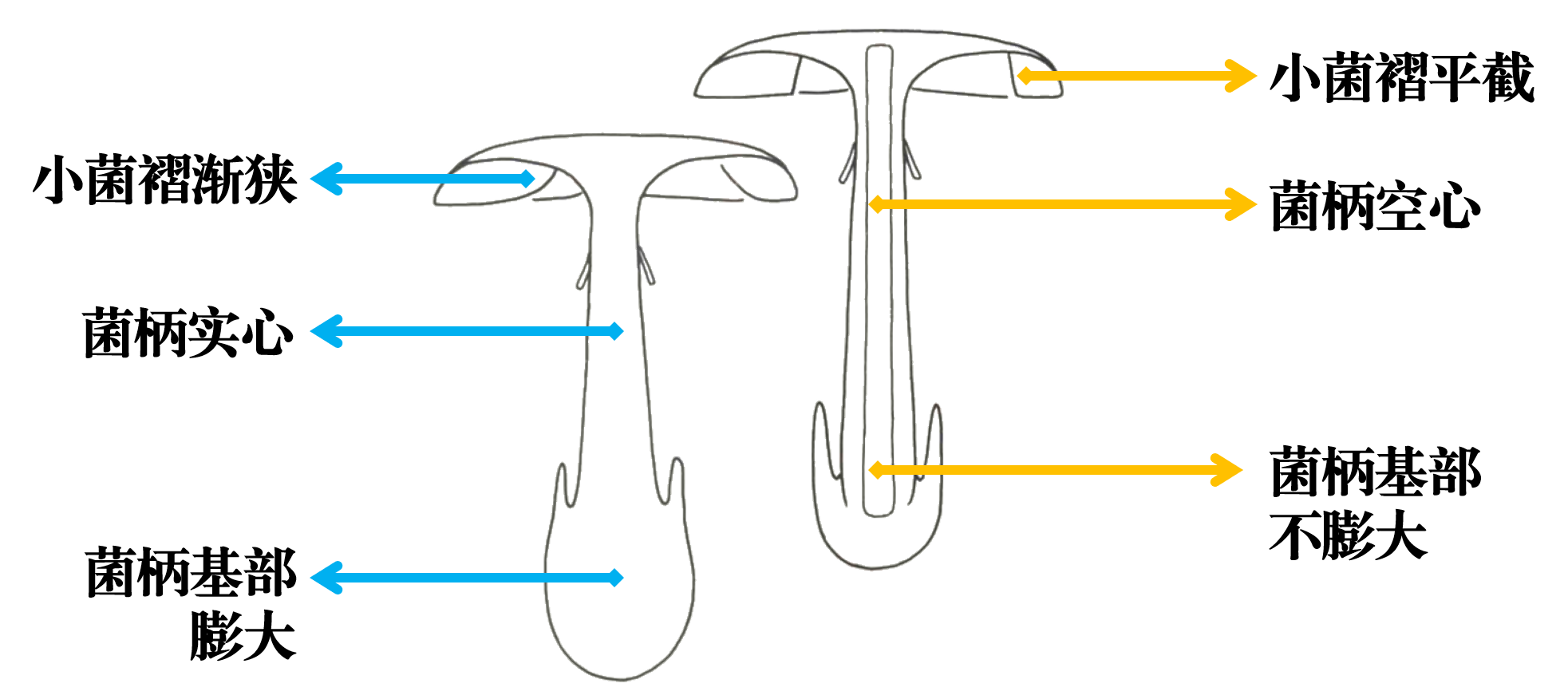 菌柄空心或实心 鹅膏属中一些物种的菌柄是空心的,另一些则是实心的。听上去很简单,对吧?但在实际操作中,菌柄的空心与否并不太容易判断,一些物种的菌柄中是”半空心“的,例如其中空心部分非常狭窄,或者某些部位空心某些部位则更接近实心,或者菌柄中间填充有疏松海绵状的菌肉等。故而我不太建议过分纠结菌柄是否空心这一特征,尽管它是鹅膏属分组依据特征之一,但毕竟还有其他的更明确的特征可供分类(如小菌褶、菌柄边缘沟纹等)。