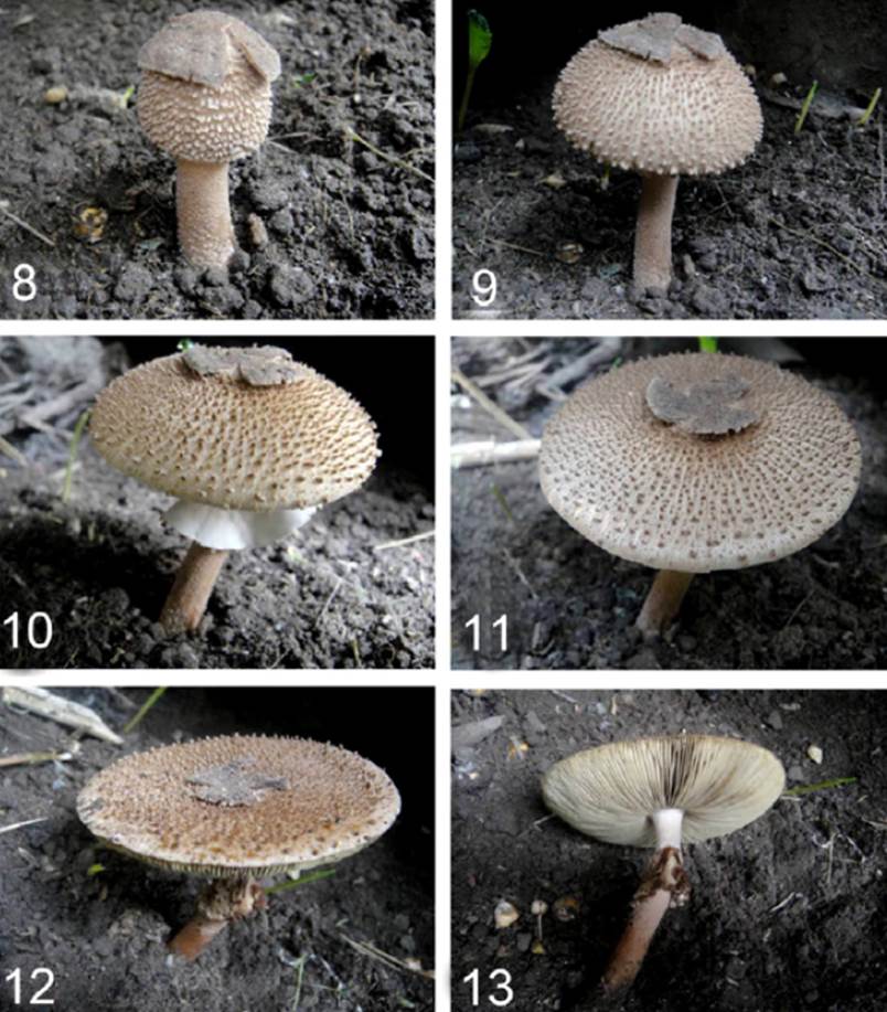 不同阶段的绿褶托菇。来源:Clarkeinda trachodes (Agaricales, Basidiomycetes), First Report from Bangladesh