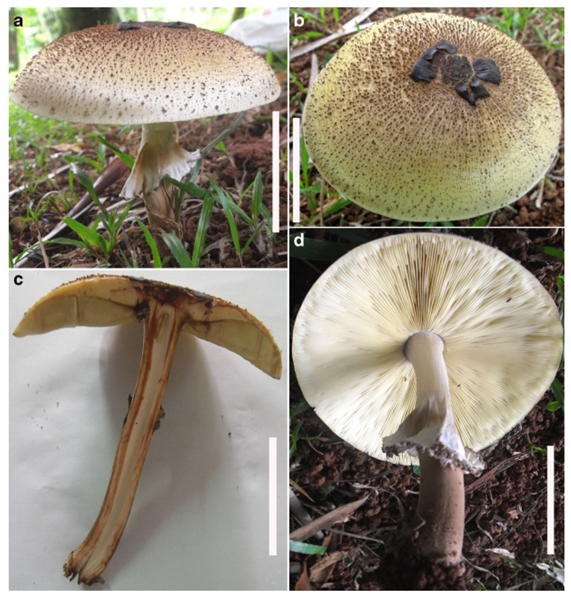 担子体中等至大型,偶小型,肉质。菌盖直径(5-)8-12(-16)cm,幼年时近球形至半球形,逐渐变为凸镜形或扁平,边缘常延伸超过菌褶;白色至淡黄褐色;被褐色、灰褐色、巧克力色至酒褐色的絮状鳞片,絮状鳞片常常聚集成翘起的小簇或小颗粒,菌盖中央被一整块的盘状或花瓣状灰褐色鳞片。菌盖菌肉受伤变红色。菌褶离生,白色至污白色,渐变为浅黄绿色,至成熟时变为绿褐色或灰黄色;密集,不等长;受伤变红色。菌柄(8-)10-14×1-3cm;中生,近圆柱形,中空,基部略膨大;上部白色,下部近褐色,菌环以下密被小鳞片。菌环上位,膜质,宽1-2cm,通常宿存。菌托膜质,污白色至灰色,经常破损。菌肉近白色,受伤先立刻变红再变褐。孢子印橄榄绿色olive-green。