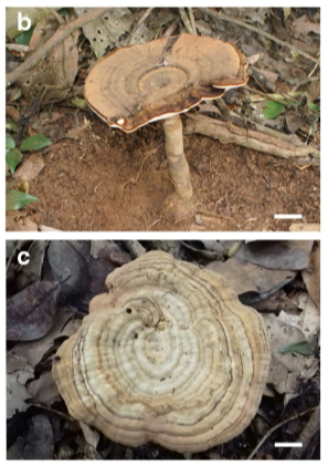 b: Cristataspora coffeata的担子果; c: Cristataspora flavipora的菌盖表面。标尺:1cm。引自Taxonomy and phylogeny of polypores with ganodermatoid basidiospores (Ganodermataceae)咖啡脊孢芝Cristataspora coffeata (Berk.) Robledo, Costa-Rezende & de Madrignac Bonzi 2020 异名: Amauroderma coffeatum (Berk.) Murrill 1905 Fomes augustus (Berk.) Cooke 1885 Fomes coffeatus (Berk.) Sacc. 1888 Fomes hemibaphus (Berk.) Cooke 1885 Ganoderma coffeatum (Berk.) J.S. Furtado 1967 Humphreya coffeata (Berk.) Steyaert 1972 Polyporus augustus Berk. 1856 Polyporus coffeatus Berk. 1839 Polyporus hemibaphus Berk. 1856 Scindalma coffeatum (Berk.) Kuntze 1898 Scindalma hemibaphum (Berk.) Kuntze 1898 子实体一年生,具中生柄,单生。菌盖圆形,略呈漏斗状,革质至木栓质;菌盖表面灰褐色,不具漆状光泽,具同心环状沟纹和皱起以及延伸至菌盖边缘的辐射状线条和不明显皱起;边缘锐,波状。菌孔面白色至奶油色;菌孔圆形;菌管灰褐色至浅褐色;菌肉奶油色,同质或具明显或不明显的黑色线;菌柄纤维质至木栓质,光滑,灰褐色,与菌盖菌肉同色,实心。 Cristataspora coffeata的担孢子电镜图(近光滑的外孢壁和具纵向排列的脊状突起纹饰的内孢壁)引自Taxonomy and phylogeny of polypores with ganodermatoid basidiospores (Ganodermataceae)分布:分布于阿根廷、古巴等新热带地区,中国没有分布 生态:生于地面,可能与地下腐木相连 讨论:该种原隶属于汉弗莱芝属,因其内孢壁具横向或纵向的脊状纹饰的形态学特征以及系统发育学分析高度支持其与C. flavipora成一单系群,故被转移至脊孢芝属中。新组合描述本种分布于新热带地区,我国过往文献记载本种在中国亦有分布,但与原始描述有出入,该种在我国可能没有分布。 相似物种:与C. flavipora较为相似,但其内孢壁脊状纹饰通常为横向分布,而本种内孢壁脊状纹饰通常为纵向排列。 新组合描述: