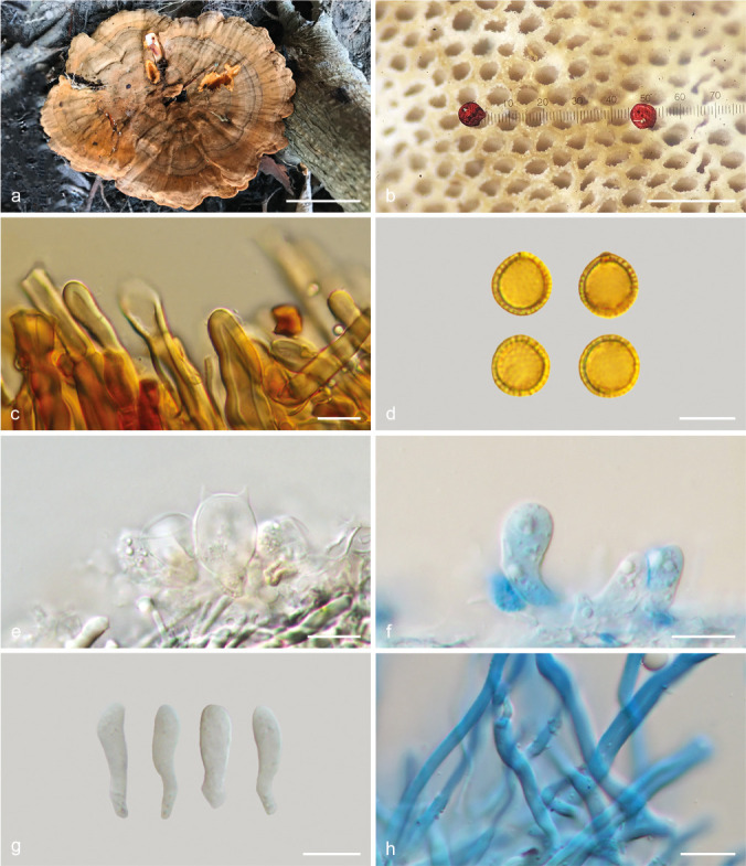 Basidiocarp stipitate, pleuro- or mesopodal. Stipe short, thin to thick, more or less round in section or slightly ellipsoid, 31-40 mm long × 3.5-22 mm wide at the occasionally slightly bulbous base, down to 5-14 mm at the apex, smooth, glabrous, covered by a hard, horny crust, brown to dark brown (mainly chocolate brown, 6E6 but up to 6F6). Pileus laterally, centrally or eccentrically attached to the stipe, spathulate, flabelliform, semicircular to dimidiate, up to 20-60 mm long, 30-90 mm wide, or circular, slightly ellipsoid, to irregular in shape, and up to (28)36-135 mm diam., applanate, horizontal, to somewhat campanulate in section, occasionally slightly umbonate at the centre, 9-15 mm thick at the base/centre, down to 1-2 mm thick at the margin. Pileus surface slightly to distinctly concentrically sulcate and radially wrinkled, dull, glabrous, covered by a crust, homogeneously brown all over the surface (chocolate brown (6E5-6), cocoa brown), greyish chocolate brown, up to dark brown (toward 6F6), or commonly with narrow to medium size, concentric, darker bands, dark brown up to blackish brown (6F5-6)) to blackish, larger and darker near the base or at the centre, rarely with a tint of reddish (7F6), occasionally paler, pale corky (4B3, 5B4, greyish orange) near the margin. Margin sharp to abruptly bent, creamy, pale corky, or concolorous with the pileus, chocolate brown. Pore surface in variable orange tint when fresh, from very pale orange, almost white, to bright orange, cadmium orange (5A8, to more commonly deep orange, carrot red, orange peel (6AB7-8), drying paler, whitish, pale orange white (6A3), greyish orange (5B4-5), or darker, near brick red or dirty brownish orange (6BC5-6, 6D5-7). Pores round, even, small, (6)7-8/mm, (85)95-147(170) µm diam. (› = 114 µm diam.). Dissepiments thick, smooth or with a slightly pruinose aspect. Trama of the stipe usually homogeneous, with a corky consistency, a fibrous texture when fresh, or heterogeneous, with the centre slightly hollowed or having a looser consistency, which is more obvious near the base, then shrinking on drying, white, whitish, and drying whitish, pale creamy, faintly pale greyish brown near the surface (the crust). Trama of the pileus 3-14 mm thick at the centre or base down to 1-3 mm thick at the margin, homogeneous, with a hard corky consistency, a fibrous texture, white, whitish, and drying whitish, pale creamy, faintly pale greyish brown near the crust. Tube layer single, 2-9 mm thick, white to pale orange when fresh, drying off-white, pale creamy, greyish orange (5B4, 6B4), light brown (6CD6-7), reddish golden, light brown), with a harder consistency, up to hard resinaceous, and a denser fibrous texture. Crust on the stipe and pileus, hard, horny, dark brown to blackish brown, 50-200 µm thick. Hyphal system di-trimitic in the context and the trama of the tubes. Generative hyphae thin-walled, clamped. Vegetative hyphae in all part of the basidiome hyaline, strongly dextrinoid, cyanophilous. Stipe and Context of a similar composition. Trama of the tubes dimitic with generative and hyaline arboriform skeletal hyphae. Mature basidia not seen. Basidiospores subglobose to globose, double-walled, the endospore thick-walled, faintly yellowish, slightly dextrinoid, cyanophilous, with conspicuous fine, cylindrical endosporic projections, the exospore hyaline, thin, negative in Melzer’s reagent not cyanophilous, the endo-exosporic space 0.5-0.8 µm thick, (6.8)7.5-9.8(10.3) × (6.5)7.0-9.0(9.5) µm, R = (1.0)1.1-1.2(1.2) (› = 8.6 × 7.8 µm, › = 1.1). Chlamydospores absent. Substrate. On soil, or wood (buried wood?). Type of rot. A white rot (positive reaction with ABTS in pure culture). Sexuality. Unknown. In pure culture, the species produce on malt agar a bright orange mycelium, up to brick red with age.
