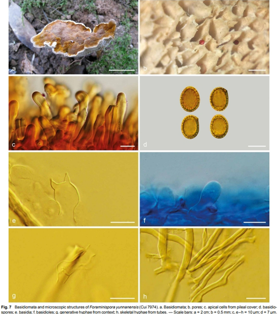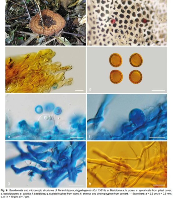 Foraminispora rugosa的菌盖表面和菌孔面。标尺:1-2: 20mm,3-4: 40mm,5-6: 70mm。来源:Taxonomy and phylogeny of polypores with ganodermatoid basidiospores (Ganodermataceae)环皱空洞孢芝Foraminispora rugosa (Berk.) Costa-Rez., Drechsler-Santos & Robledo 2017 异名: Amauroderma avellaneum Murrill 1908 Amauroderma dubiopansum (Lloyd) Ryvarden 2004 Amauroderma dubiopansum (Lloyd) Dennis 1970 Amauroderma sprucei (Pat.) Torrend, Brotéria 1920 Ganoderma avellaneum (Murrill) Sacc. & Trotter 1912 Ganoderma sprucei Pat. 1894 Polyporus dubiopansus Lloyd 1912 Porotheleum rugosum Berk. 1856 子实体一年生,具中生或侧生柄,软木栓质。菌盖圆形或半圆形、扇形至匙形,平展;菌盖表面灰巧克力褐色至暗褐色,不具漆状光泽,光滑,具明显或不明显的同心环状沟纹和辐射状皱起;边缘锐,波状,与菌盖同色。菌孔面新鲜时橘色,干燥时浅橘色;菌孔圆形,较小;管壁厚;菌管新鲜时白色至浅橘色,干燥时近白色至浅奶油色、灰橙色;菌肉白色至奶油色、浅灰褐色,同质;菌柄圆柱形,光滑,褐色至暗褐色,菌柄基部略膨大,实心。 分布:分布于巴西、阿根廷、法属圭亚那等新热带地区,中国没有分布 生态:生于地面或生于阔叶树腐木桩 营养类型:腐生Saprotrophic 讨论:此种原隶属于假芝属,因其具孔洞的外孢壁这一奇特超微特征特征以及系统发育学分析高度支持其单独成一支系,故被转移至新成立的空洞孢芝属中。 描述: