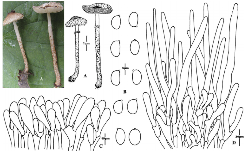 该物种的主要特征是担子果很小,菌盖白色至米色,中央被褐色至黄褐色细鳞片,边缘有不太明显的辐射状沟纹;菌柄白色;菌环白色,容易脱落;菌褶白色,离生;担孢子椭圆形至近杏仁形(5-6×3-3.8μm);盖表鳞片由膨大细胞组成。该物种模式标本采自斯里兰卡,记载...... | ![]() |