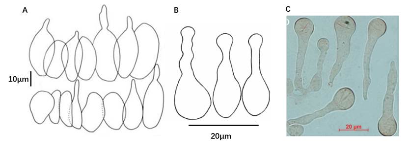 讨论:许多文献中将小蘑菇属物种的褶缘囊状体描述为capitate或subcapitate(头部或中上部有缢缩)。实际上,根据许多小蘑菇属物种报道中提供的褶缘囊状体形态,小蘑菇属的褶缘囊状体形态十分多变,从圆柱状cylindrical、芜菁状napiform、顶端缢缩突起状mucronate、烧瓶状lageniform、顶端缢缩capitate、顶端膨大等多种形态,甚至还有顶端膨大,颈部缢缩,基部再次膨大的形态。不同小蘑菇属的褶缘囊状体形态见下图。