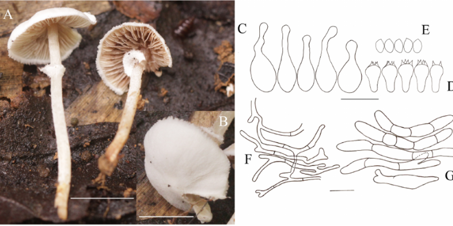 该种的主要特征是子实体细小,白色;菌盖宽2.5-6mm,菌柄长1.2-1.7mm;菌褶白色至淡褐色,离生;担孢子 (5.0) 5.5–6.0 (6.5) × 3.0–3.7µm,平均5.7×3.4μm;褶缘囊状体顶端偶尔存在分叉。相似的物种中,仅二瓣小蘑菇...... |