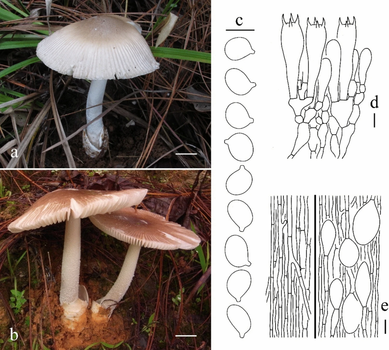 该种的主要特征是担子果大,白色;菌盖宽13-15cm,边缘有短沟纹;盖表和菌柄基部被大的,黄白色,近锥状或金字塔状的菌幕残余,没有成型的菌托;菌柄部分空心,基部不膨大;菌褶白色,离生,小菌褶近平截;菌环白色,上位;担孢子宽椭圆形至椭圆形,非淀粉质;子实体各部位......