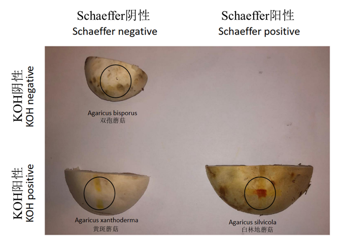 滴加化学试剂。强碱溶液,如2%-10%KOH、NaOH(火碱、烧碱)(一般浓度为5%)滴加在菇体上,可以使部分蘑菇属物种的菌肉快速变黄,此为阳性反应,若不变色或仅表现为被水浸润的褐色则为阴性。饱和Na2CO3(苏打,纯碱)溶液也有一定变色效果,但更淡。